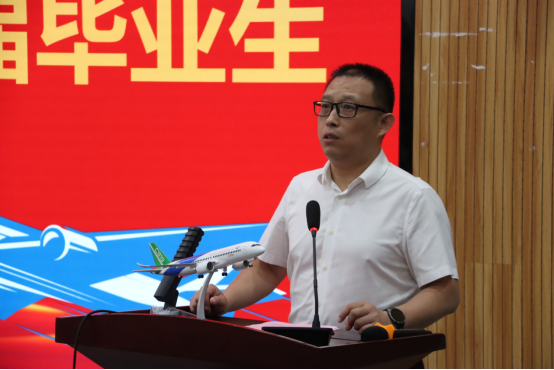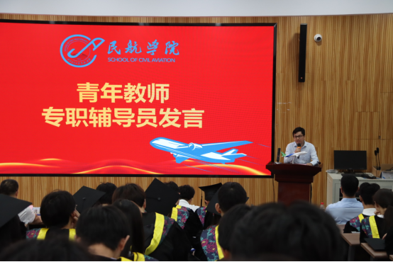 首先,党总支书记闫伟为毕业生讲最后一节思政课。闫伟代表学院向全体毕业生及师长亲友致以热烈祝贺和诚挚感谢。他回顾了同学们四年来在学业竞赛、科研创新、社会实践等各方面的优异表现。他说,低空经济这一新兴产业前景广阔,民航学子在相关领域将大有可为,勉励大家将个人理想融入民航强国建设。最后,闫伟期待大家在新征程上再创辉煌,常回家看看。