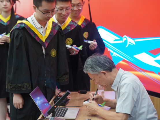 在讲座最后的互动环节,同学们踊跃提问,并纷纷拿出提前准备的C919模型请陈总师签名留念,场面温馨热烈。