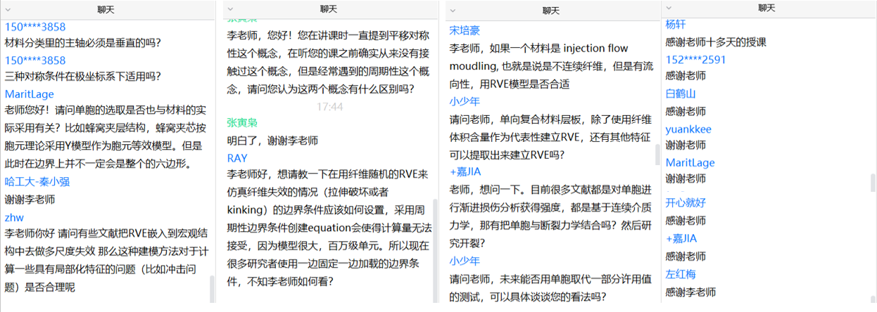 系列课程中,同学们与李曙光教授就复合材料单胞的建模、平移对称性以及复合材料力学未来发展等方面进行了交流研讨。同学们对此次课程给予了高度评价,同时对李曙光老师的精彩课程内容与耐心解答表示了感激。