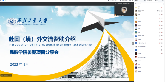 会上,beat365中文官方网站2023年暑期海外交流项目的带队老师代表田薇、和麟,从出国(境)交流项目的申请条件、获资助情况、交流收获及交流期间了解到当地留学申请的条件和优势做了详细的介绍,鼓励同学们尽早明确目标,提前规划,把握出国(境)交流学习的机会。学生代表赵瑨(博士生)、吴沛坤(本科生)分别从自身角度出发,向与会的全体学生分享出国参加此次暑期项目的心得与收获,他们坦言,此次交流不仅让他们了解到国外先进的航空宇航知识,体验了当地的风土人情,更增长了见识,坚定了他们要学好本领、航空报国的决心。
