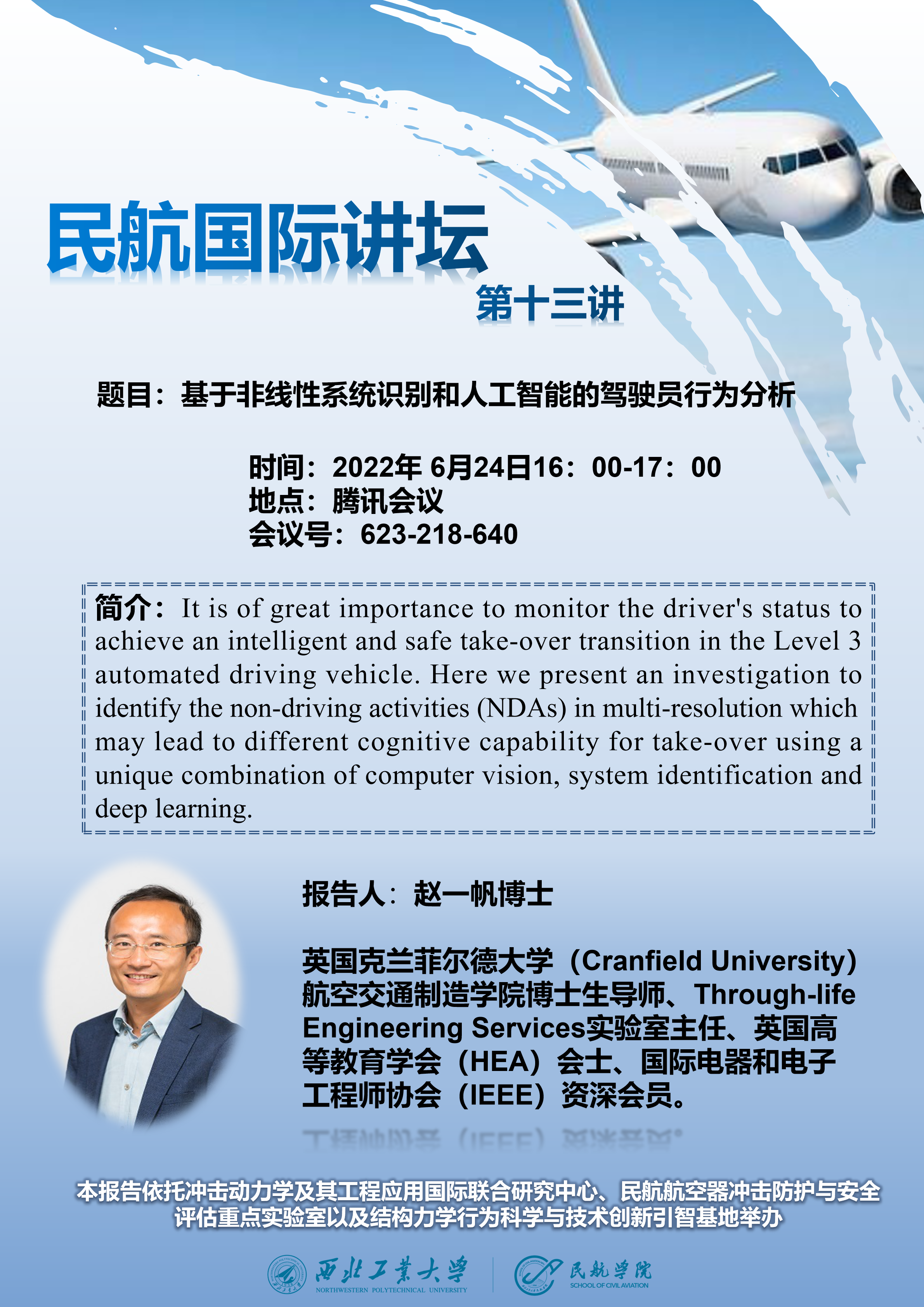 6月24日下午四点,我院拟线上举办“基于非线性系统识别和人工智能的驾驶员行为分析”专题讲座,届时欢迎各位老师同学参会交流。报告信息如下: