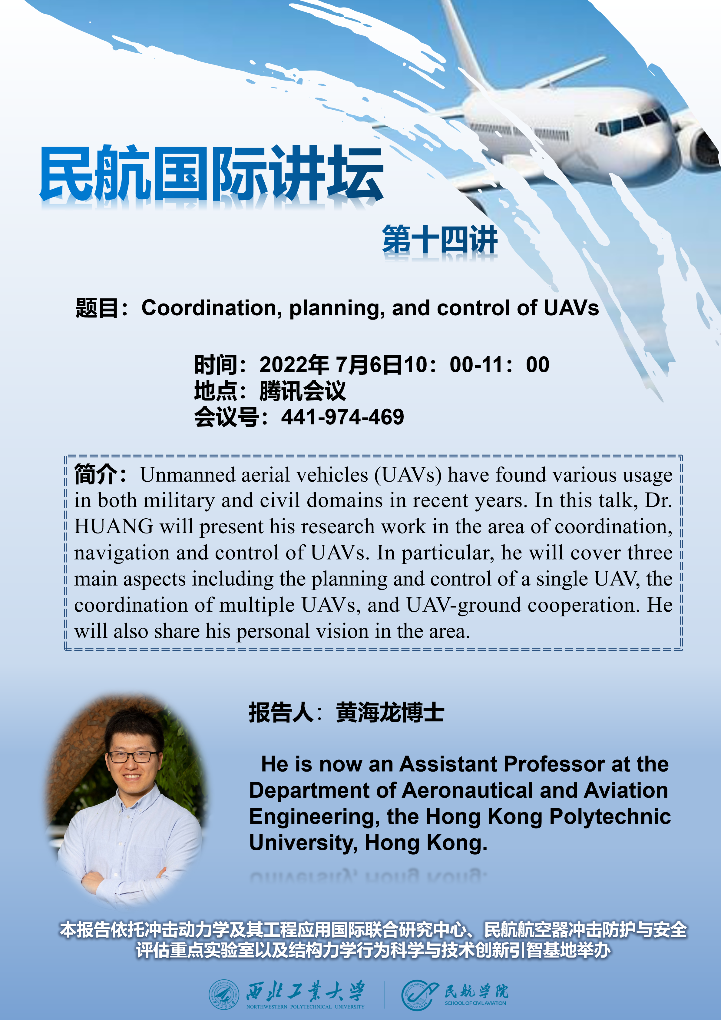 7月6日上午十点,我院拟线上举办“Coordination, planning, and control of UAVs”专题讲座,届时欢迎各位老师同学参会交流。报告信息如下: