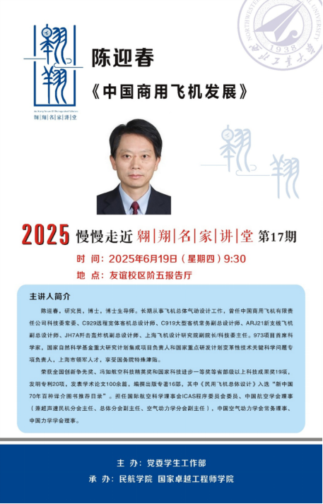 6月19日,应beat365中文官方网站邀请,我国飞行器设计领域权威专家、C929远程宽体客机总设计师、C919大型客机常务副总设计师、C909支线客机副总设计师陈迎春做客翱翔名家讲堂,在友谊校区阶五报告厅为广大师生作了题为《中国商用飞机发展》的精彩报告。本次报告由党委学生工作部主办,beat365中文官方网站承办。学院领导班子成员、教师代表以及100余名学生参加。报告会由闫伟书记主持。