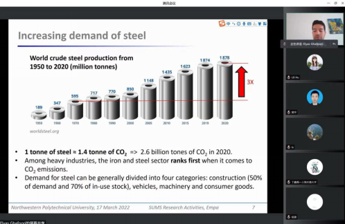 Ghafoori博士首先介绍了他所在持续金属结构组(SUMS)的主要研究方向和团队成员概况,并解释了其科研工作的开展背景:当前,钢铁行业产生的二氧化碳排放量约为26亿吨,是当前地球上最大的二氧化碳排放源之一,为了达到欧盟目标——在2050年实现碳中和,需要发展可持续金属结构,在应对钢铁行业日益增长的需求同时,减少温室气体排放。