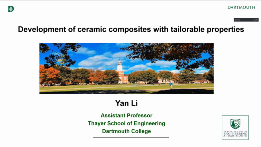 6月10日,美国达特茅斯学院工学院助理教授Li Yan应我院副教授张昊邀请,为民航国际讲坛作“Development of ceramic composites with tailorable properties”线上讲座,学院广大师生参加了此次讲座。讲座由学院教授汪万栋主持。