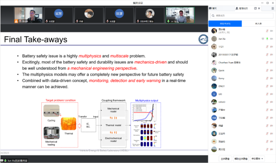 讲座中,许骏介绍了其团队近些年在锂离子电池安全方面的研究。从电极、单体尺度的多物理场建模和表征入手,系统性地讲解了力学载荷触发电池内部短路的过程和机理。之后,介绍了将机器学习算法与基于物理的建模相结合,实现电池安全风险快速准确预测的相关工作,阐述了其关于锂离子电池多物理场安全行为的新见解,并为电池安全设计、评估和监测提供了独到思路。