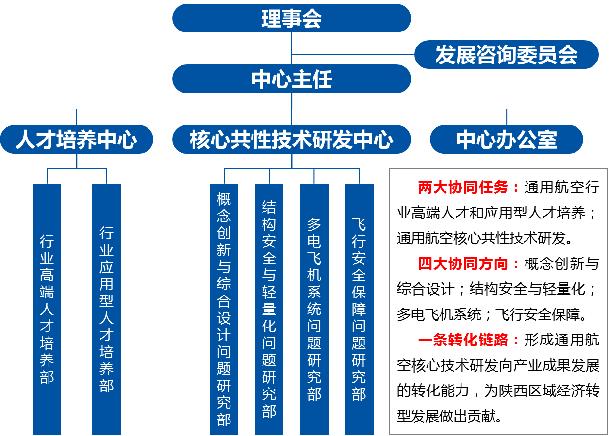 陕西通用飞机协同创新中心以通用飞机领域国家重大需求、未来10到20年世界一流水平的通用飞机核心共性技术需求为牵引,在陕西省政府主导下,依托beat365中文官方网站的相关优势学科,以概念创新与综合设计、结构安全与轻量化、多电飞机系统和飞行安全保障4项核心关键问题和人才培养为协同目标,与中国民用航空西北地区管理局、西安阎良国家航空高技术产业基地、渭南卤阳湖现代产业综合开发区管理委员会、西安航空学院、国家驻陕航空设计与制造企业主要创新力量及国际同领域顶尖研究力量深度融合,通过机制体制改革,有效汇聚人才、学科以及陕西省重点实验室资源,培养行业创新人才,产出一批重大标志性成果,提升高校人才、学科、科研三位一体的创新能力,成为具有国际一流水平的研究中心,为推动科教强省战略,实现创新型陕西的奋斗目标,提供强有力的智力支撑与人才保障。