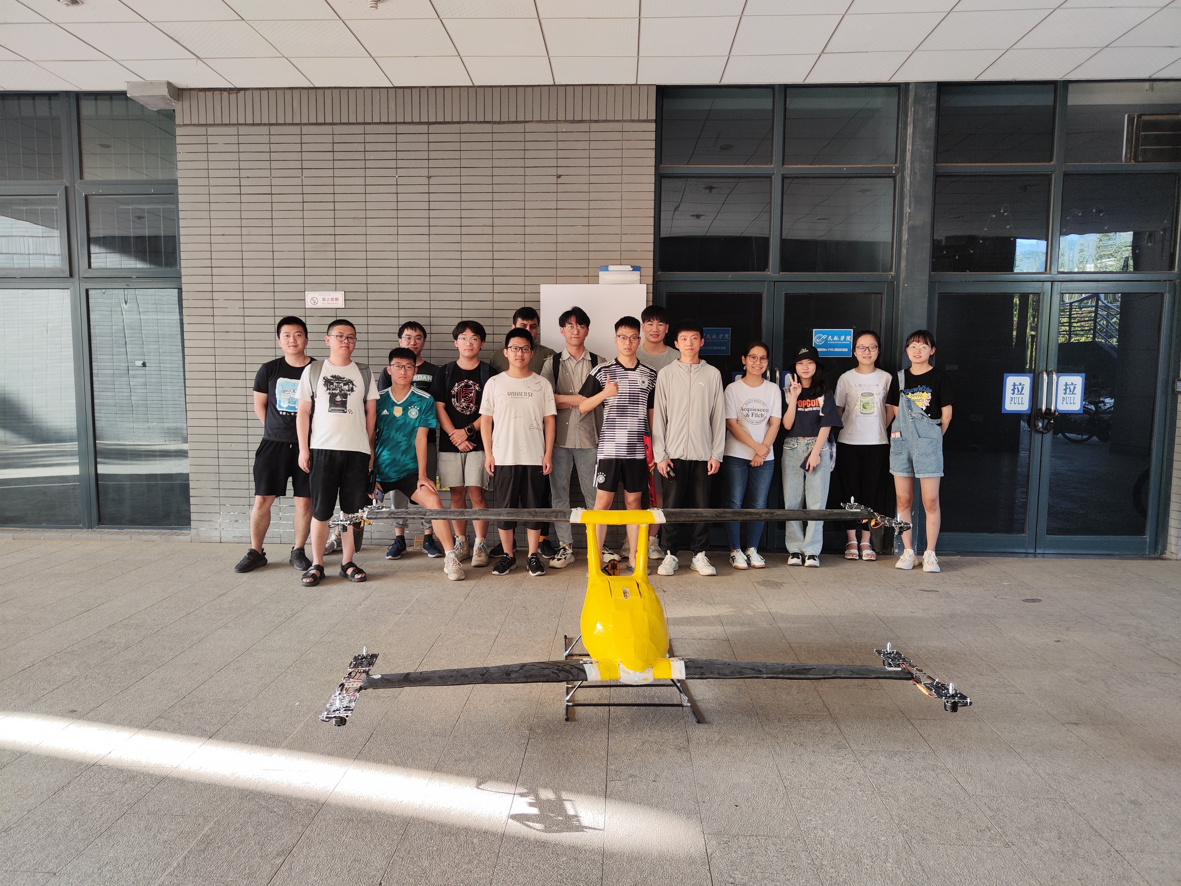 这是beat365中文官方网站首架蜻蜓号e-VTOL飞行器的调试现场。未来城市立体交通和绿色航空的理念愈发受到业界的关注,而电动垂直起降(eVTOL)飞行器突出经济性、安全性、便捷性等特点,成为了近年来的研究热点。beat365中文官方网站主动迎接行业发展浪潮,决策在2022届本科生的集体毕设中完成一架垂直起降飞行器的技术验证。此次团队毕设项目总负责人是beat365中文官方网站的崔浩教授,汪万栋、邬晓敬、闫浩、赵闻、党庆庆、徐扬、黄甲、崔森林、叶信立、戴维、全勇共12位教师参与,此外还有彭昱萌等11位2022届毕业生、TONG Li Seng(马来西亚)等6位留学生和张家等14位其他年级本科生参与其中。