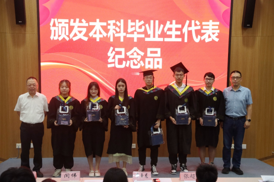 院长李玉龙、党总支书记闫伟为本科毕业生代表颁发纪念品并合影留念。