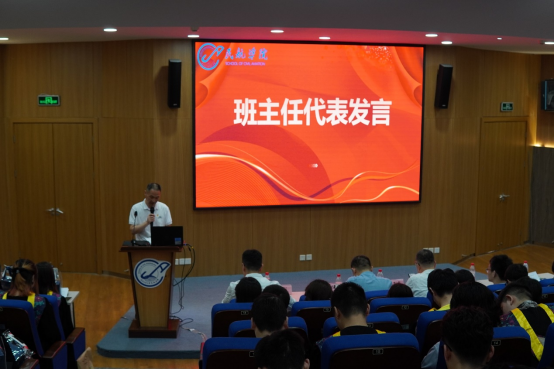 20级班主任代表马宗耀发言,他表达了对即将踏上新征程的毕业生的祝福,对他们的成长和蜕变表示了欣慰,并鼓励毕业生们在职业生涯中保持谦逊和乐观的心态。