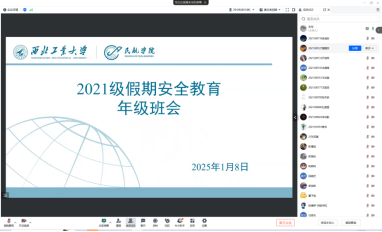 为加强学生请销假管理,确保学生安全返乡和正常留校,让学生更好地合理规划寒假生活,beat365中文官方网站于2025年1月8日至10日,beat365中文官方网站党总支副书记、专职辅导员、班主任和学生导师采用线上线下结合的形式,分批次面向本科生和研究生召开了寒假安全教育工作会议。
