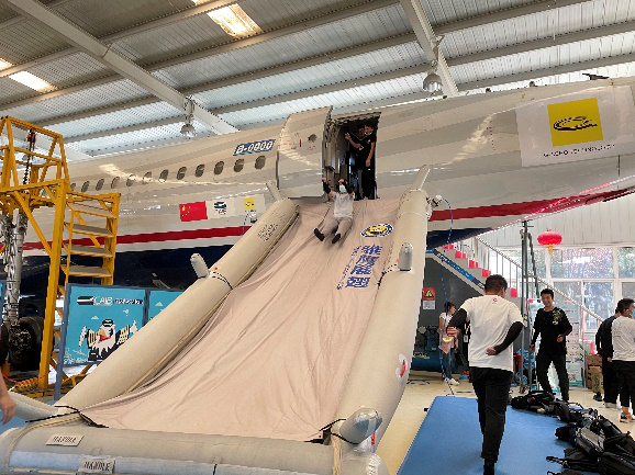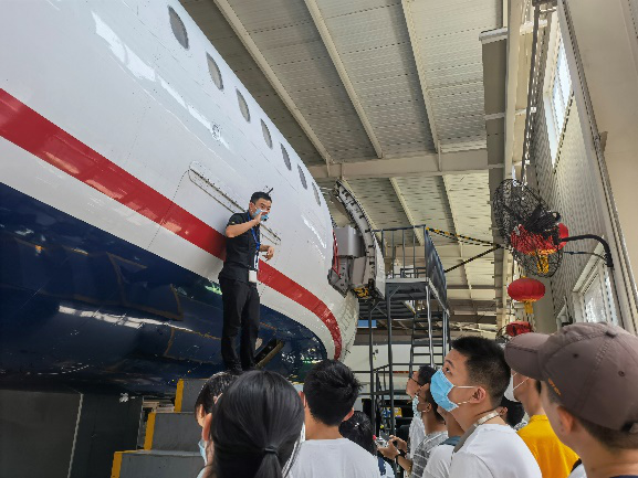 在上午的体验过程中,同学们在讲解员的带领下,首先进行了空客A320客机的绕机检查——这是了解飞机整体状态、保障飞行安全的第一步。通过这个项目的学习,同学们不仅更加详细和系统地认识了民用飞机的构造,细致的检查要求也让同学们深深体会到了民航人严谨科学的专业精神和敬业奉献的职业操守。随后,同学们与多款现役的固定翼飞机、直升机、自转旋翼机以及飞机发动机进行了“零距离”接触,了解飞行器种类、结构,学习飞行器制造相关知识。最后,同学们不仅集体学习了航空应急撤离知识,还通过撤离安全滑梯这个课目的应急演练,现场检验了学习效果。