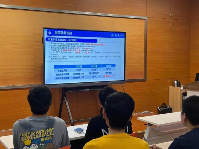 会上,朱莉老师首先就大家普遍面临的“考研还是就业”的选择问题,提出了“合理定位、慎重选择”的建议,引导大家思考本科毕业后的发展问题。随后,她从考研形势逐年严峻、“二战上岸”比例低、未来成长与学历的关系等三方面,向大家提供统计数据和分析材料,分享相关情况。最后,她向大家介绍了考公务员、军官直招、应征入伍等除考研和到企业就业之外的其他发展道路。