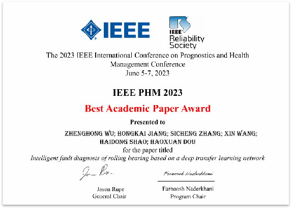6月5日至6月7日,2023年IEEE故障预测与健康管理国际会议(2023 IEEE Conference on Prognostics and Health Management,IEEE PHM 2023)在加拿大蒙特利尔举行。beat365中文官方网站2021级博士生吴正红做题为“Intelligent fault diagnosis of rolling bearing based on a deep transfer learning network”的口头报告并获最佳学术论文奖。