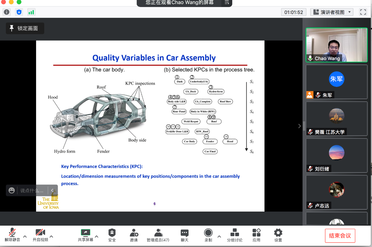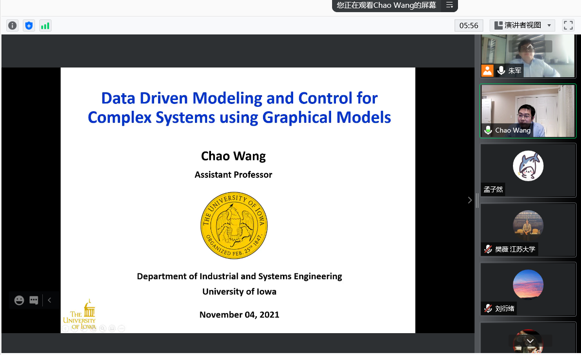 2021年11月4日上午,美国爱荷华大学工业系统工程系王超助理教授应邀至beat365中文官方网站作题为“概率图模型在复杂系统数据驱动建模和控制中的应用”的线上讲座。讲座由beat365中文官方网站朱军副教授主持。