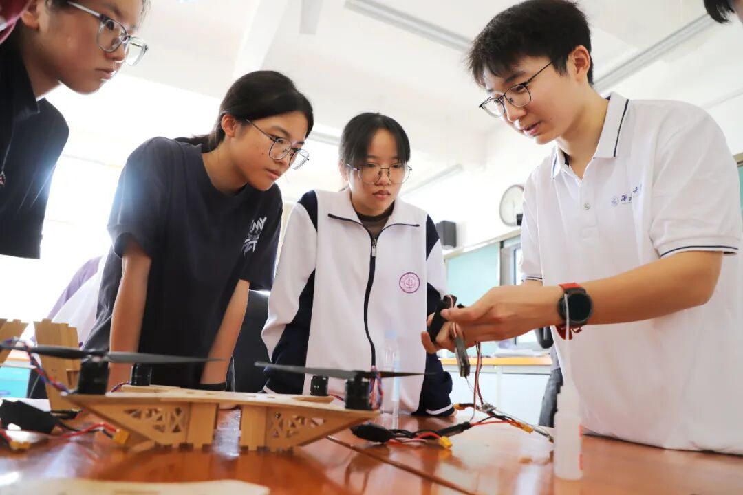 在拼装实践环节,团队成员为同学们分发了以竹子为原料制作的无人机散件,手把手指导大家进行组装调试。从机架拼接、线路连接到设备校准,团队成员耐心解答同学们的疑问,重点讲解组装过程中的受力原理与安全注意事项。