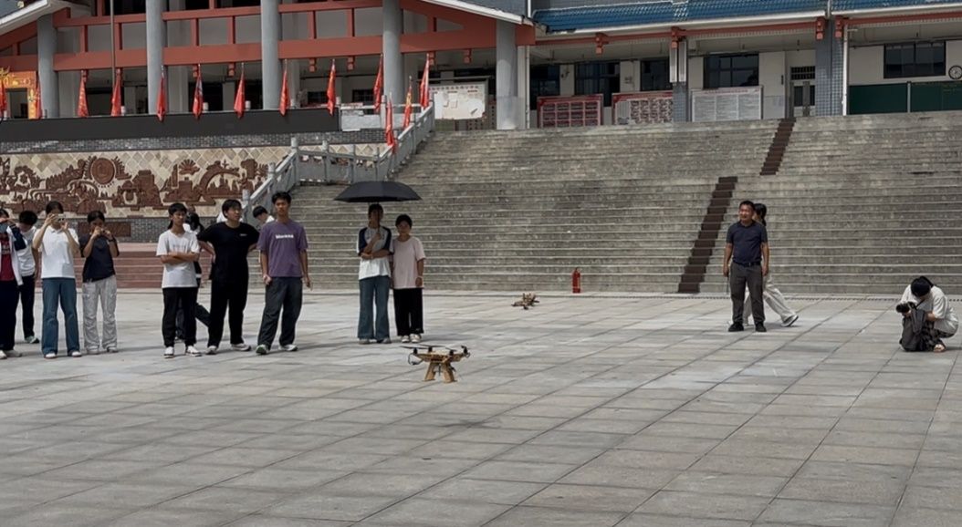 在最后的实操飞行环节,校园操场变身“飞行训练场”。团队成员首先进行示范飞行,操控着竹制无人机在空中完成悬停、盘旋、直线飞行等系列动作,引得同学们阵阵欢呼。随后,在团队成员的保护与指导下,同学们学习了无人机起降控制与航线调整的技巧,并轮流上手操作,在实践中深化对飞行原理的理解。